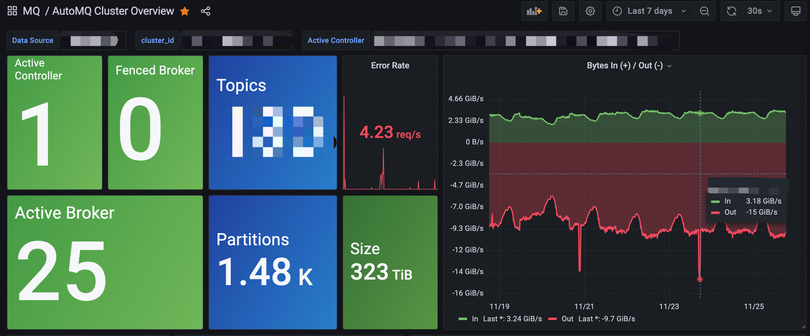 Currently, Zhihu has deployed AutoMQ on a large scale on its bare-metal self-built K8s cluster, with the peak traffic load of the cluster nearing 20 GiB/s, as shown in the figure below.