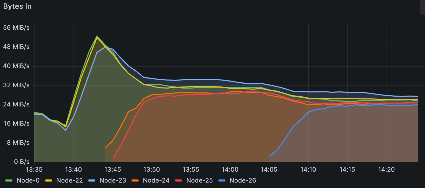 The following figure demonstrates the traffic self-balancing effects using the above mathematical model (Image source: AutoMQ internal LongRunning monitoring dashboard):