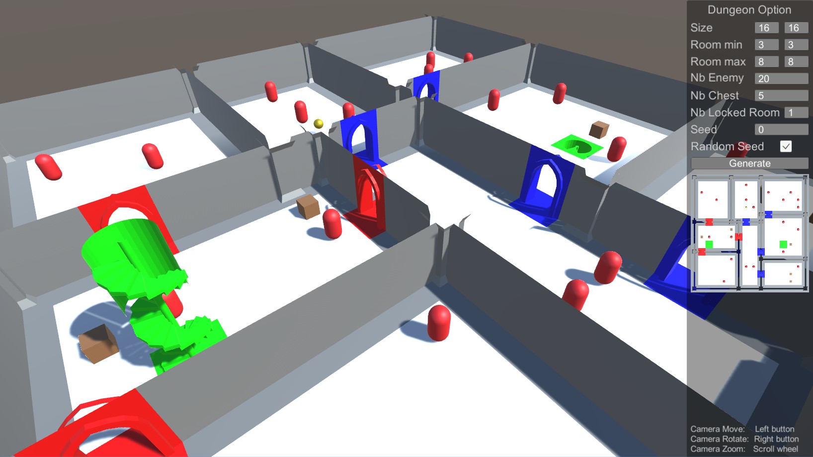 - Rooms can be locked and keys are automatically generated with a valid path from the entrance to allow player to pick them up,