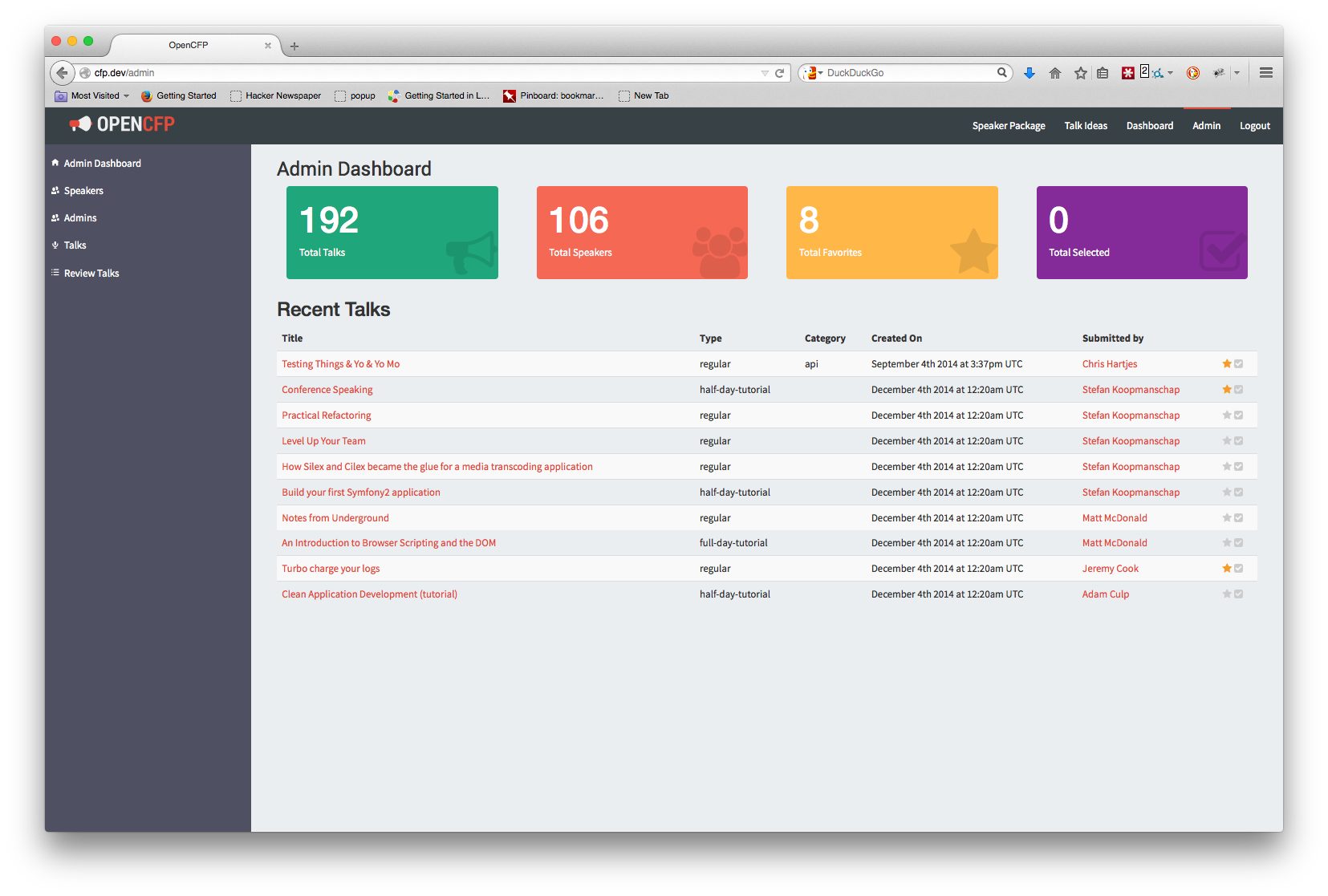 - Administrative dashboard for reviewing submitted talks and making selections.