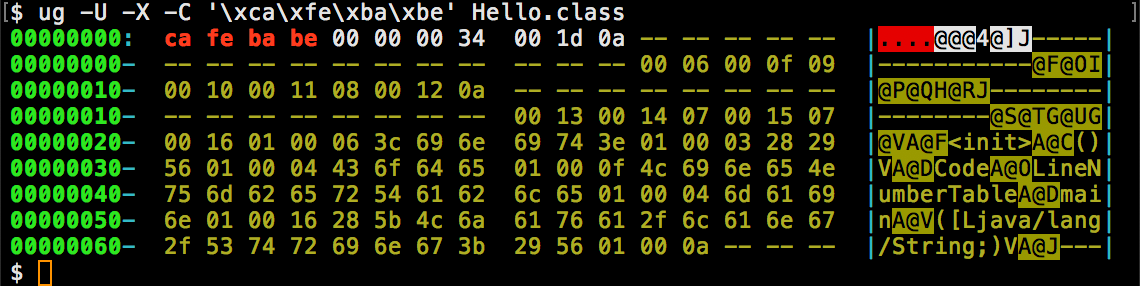 Options -U, -W and -X search binary files, displayed as hexdumps: