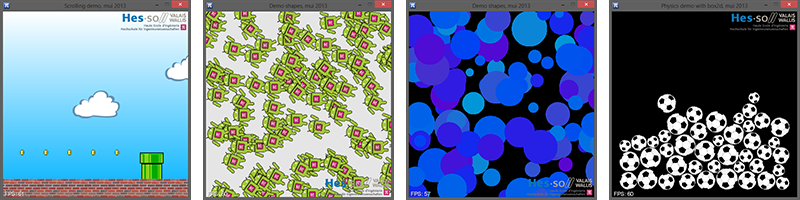 The library contains simple to use graphical primitives such as lines, circles, rectangles. In addition, there are methods to draw pictures, rotate them, scale them etc. Physics simulation is also supported (using Box2D) as well as music and sound playing.