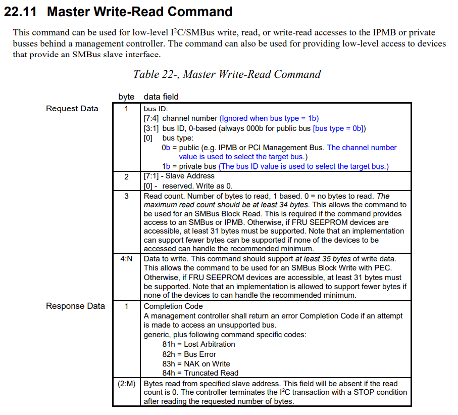 Also keep in mind that IPMI specification uses only 3 bits in command for I2C bus encoding. This means that it is not possible to access I2C busses with a bus number higher than 7 (i2c-7