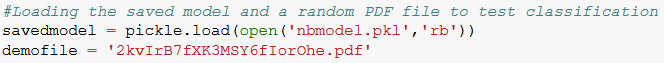 The saved model has correctly predicted the class of the input file. The saved model had predicting accuracy of around 94% with a good precision for all classes above 90%. Different classification models can be trained for this task and compared for their perfomances.