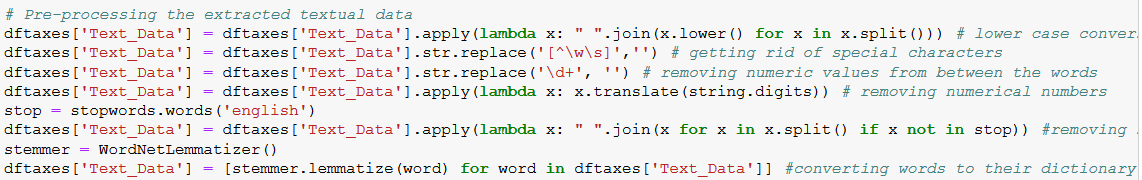 The next step involves pre-processing the texts. Approaches taken include lowercasing, removing special characters, removing number between words and digits itself, removing stop words and converting words to their dictionary form through lemmatization.
