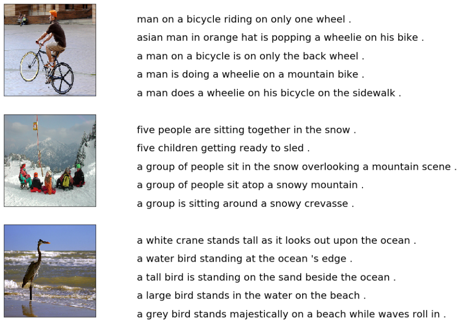 FLICKR_8K. This dataset includes around 1500 images along with 5 different captions written by different people for each image. The images are all contained together while caption text file has captions along with the image number appended to it. The zip file is approximately over 1 GB in size.