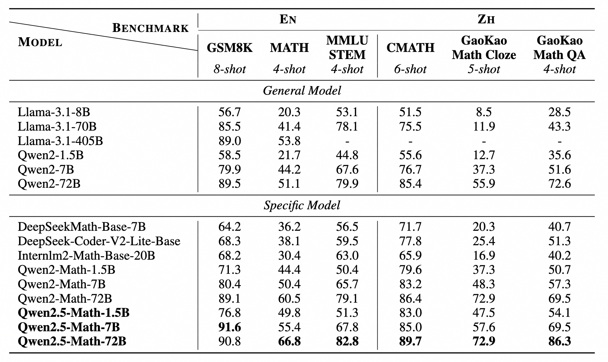We evaluate our Qwen2.5-Math base models on three widely used English math benchmarks GSM8K, Math, and MMLU-STEM. In addition, we also evaluate three Chinese math benchmarks CMATH, GaoKao Math Cloze, and GaoKao Math QA. All evaluations are tested with few-shot chain-of-thought prompting.
