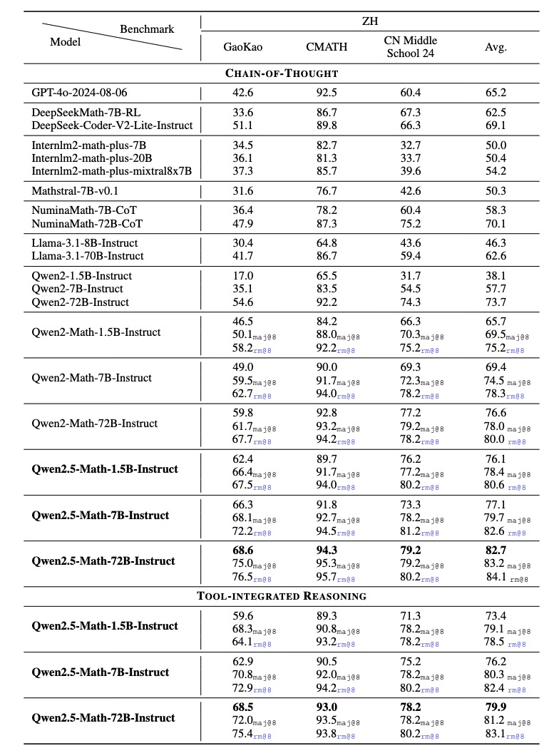 We evaluate Qwen2.5-Math-Instruct on mathematical benchmarks in both English and Chinese. In addition to the widely-used benchmarks, such as GSM8K and Math, we also involve more exams that are more challenging to fully inspect the capabilities of Qwen2.5-Math-Instruct, such as OlympiadBench, CollegeMath, GaoKao, AIME2024, and AMC2023. For Chinese mathematical benchmarks, we use CMATH, Gaokao (Chinese College Entrance Examination 2024), and CN Middle School 24 (China High School Entrance Examination 2024).
