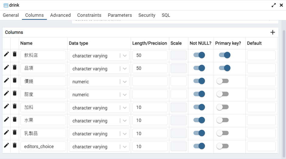 在column的命名上,考量到我們資料中的飲料店都位於台灣,未來若要更新資料時,用中文會更方便也更直覺,所以column的名稱和資料的內容皆以中文來儲存。另外,因為我們的程式在執行query時,每次都需要同時對很多個columns做篩選,所以我們沒有使用index。