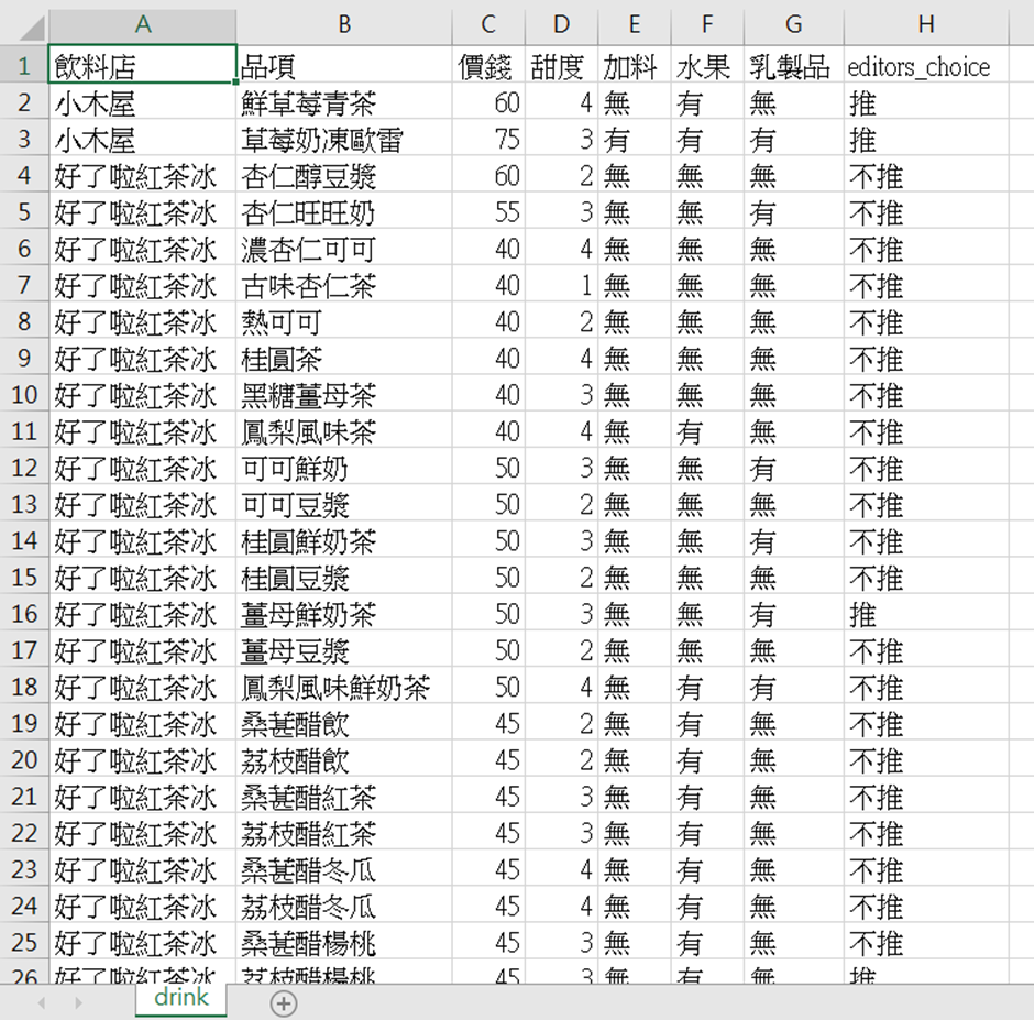 我們的資料來源是台灣各家飲料店的菜單,但因為菜單大都由紙本或圖片的方式呈現,所以原始資料的csv檔是由我們自己手動輸入的。目前我們主要輸入了5家飲料店的菜單,未來有機會會持續更新。