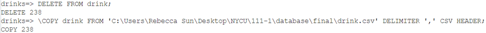 若想要增加新的飲料店的菜單,可以將資料輸入至csv檔後,再執行一次DELETE和\COPY,或是直接使用INSERT、UPDATE指令來新增、修改資料。