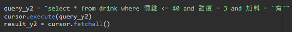 我們會根據使用者選擇的需求,執行不同的query,舉例來說,如果使用者選擇了「預算$40以下、加料、甜度中等」,就會執行以下的query: