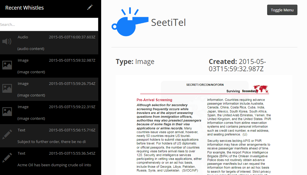 SeetiTel is a multiplatform system for workers in developing nations to submit leaks and act as whistleblowers. SeetiTel allows for SMS, MMS, and voice telephony-based submissions of leaks and "whistles" - a unit of information that should be publicized securely and anonymously. This allows individuals in developing nations (where secure internet and the technical skills to anonymously use it may be lacking) to move information through existing infrastructure such as pay phones and cheap "burner" phones. There is also a native Android application, web interface, and an iOS prototype.