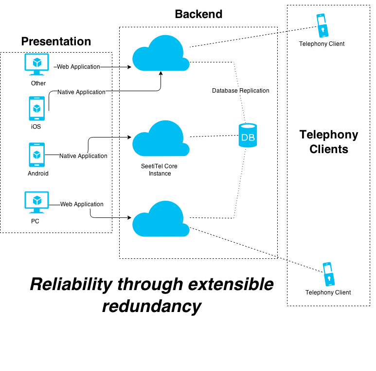 SeetiTel is built with openness and resilience through distribution in mind. The SeetiTel Core is the repository for all information in the system and can utilize rqlite to replicate data, allowing for a cloud of backend instances.