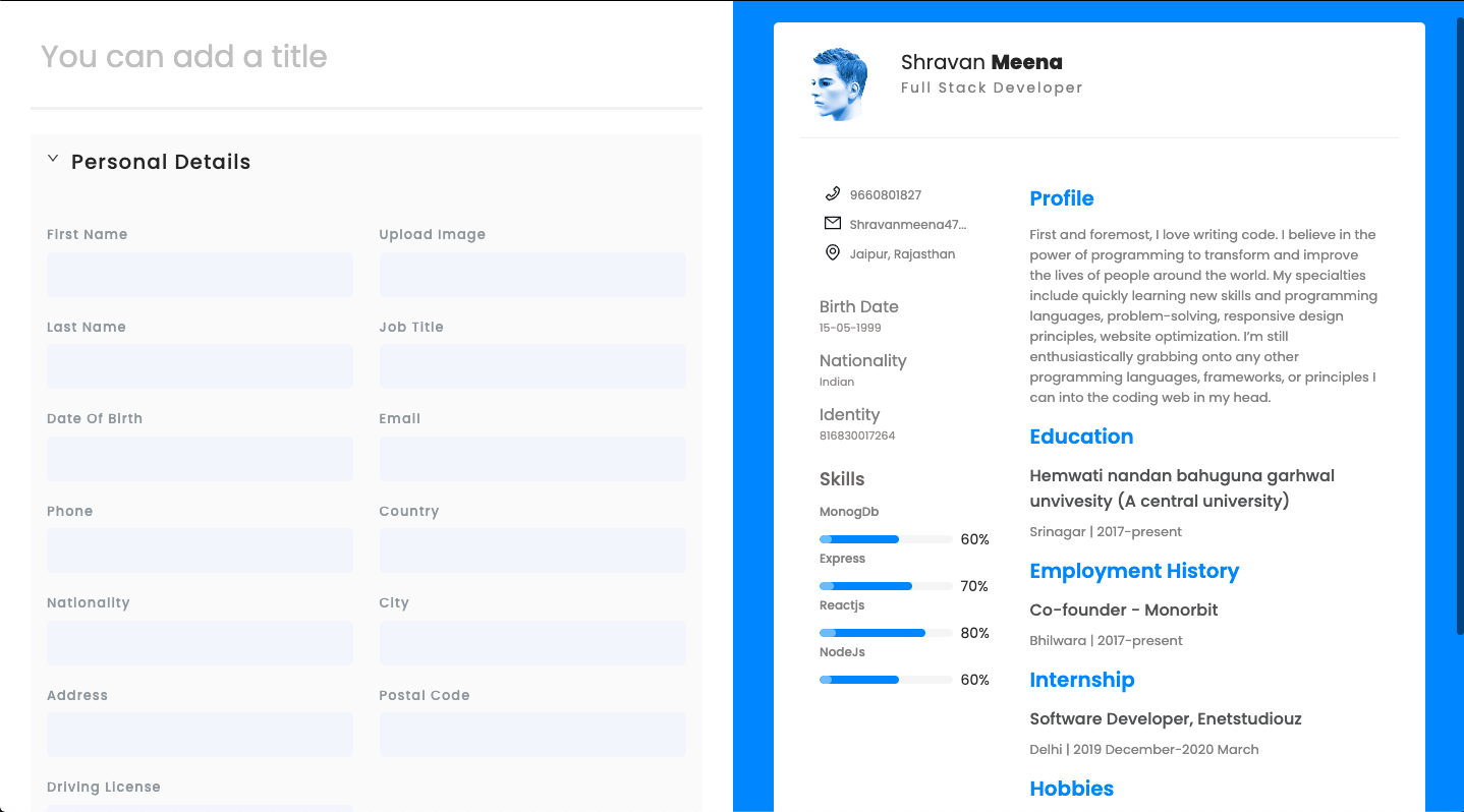 In this poroject you can create your own resume with some built in templates.You just fill your details and see magic.