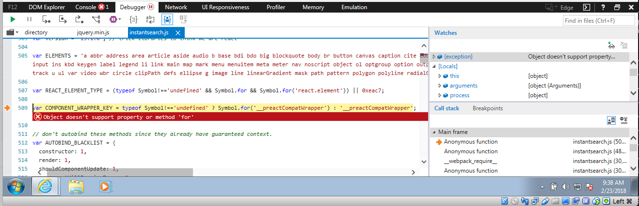 Symbolpolyfill is present (which is included with the library), the instantsearch script presumes thatSymbolis fully implemented. However,Symbolpolyfills cannot replicate the behavior fully.This causes the instantsearch script to error out and cause problems on