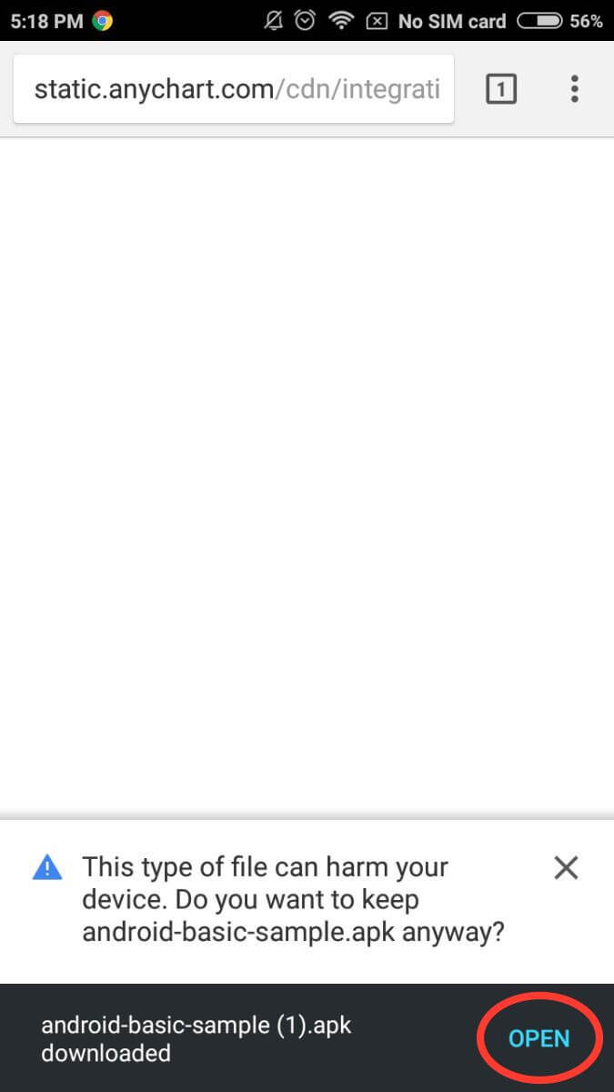 To run AnyChart sample on your Android device simply open android-basic-sample.apk URL in your device browser. The sample application will be automatically downloaded and an installation process will be started. The following screenshots show all steps of the installation process: