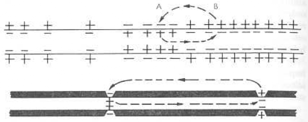 This document describes an algorithm to plot current loops in a multicompartmental simulation. « Current loop » refers to the current that enters the membrane at one point, flows intracellularly in the longitudinal dimension, goes out of the membrane, and then closes the loop extracellularly. It shows how current circulates in the neuron. Here is an example of loop shown in by Hodgkin (1964) to illustrate the spread of an action potential in an axon :