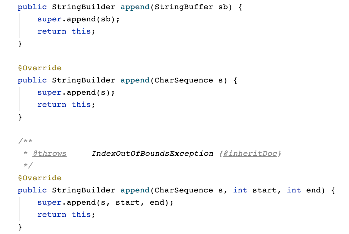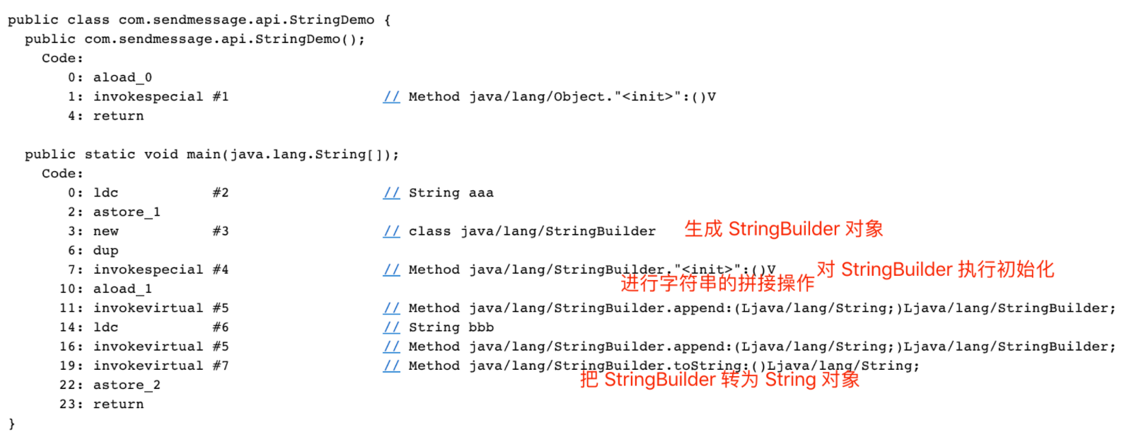 上面的 String 对象竟然和 StringBuilder 产生了千丝万缕的联系。不得不说 StringBuilder 是一个牛逼的对象。String 对象底层是使用了 StringBuilder 对象的 append 方法进行字符串拼接的,不由得对 StringBuilder 心生敬意。