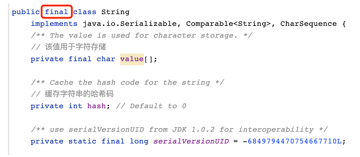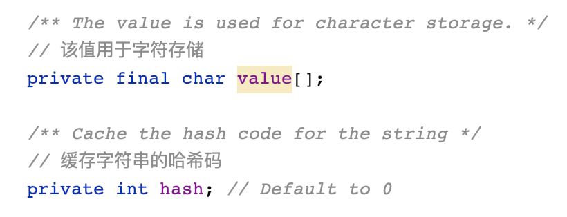 ,这个数组存储了每个字符。另外一个就是 hash 属性,它用于缓存字符串的哈希码。因为 String 经常被用于比较,比如在 HashMap 中。如果每次进行比较都重新计算其 hashcode 的值的话,那无疑是比较麻烦的,而保存一个 hashcode 的缓存无疑能优化这样的操作。