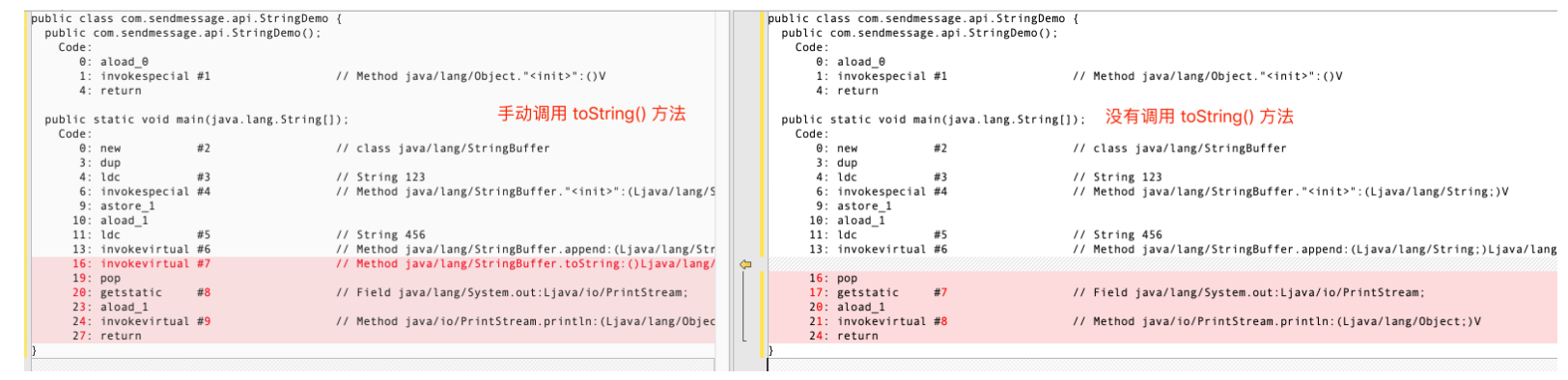 上图左边是手动调用 toString 方法的代码,右图是没有调用 toString 方法的代码,可以看到,toString() 方法不像 +