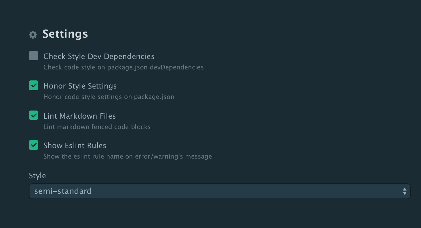 $ nvm alias default node$ brew install git yarn$ apm install editorconfig linter linter-js-standardSet the style to Semi-Standard in linter-js-standard: