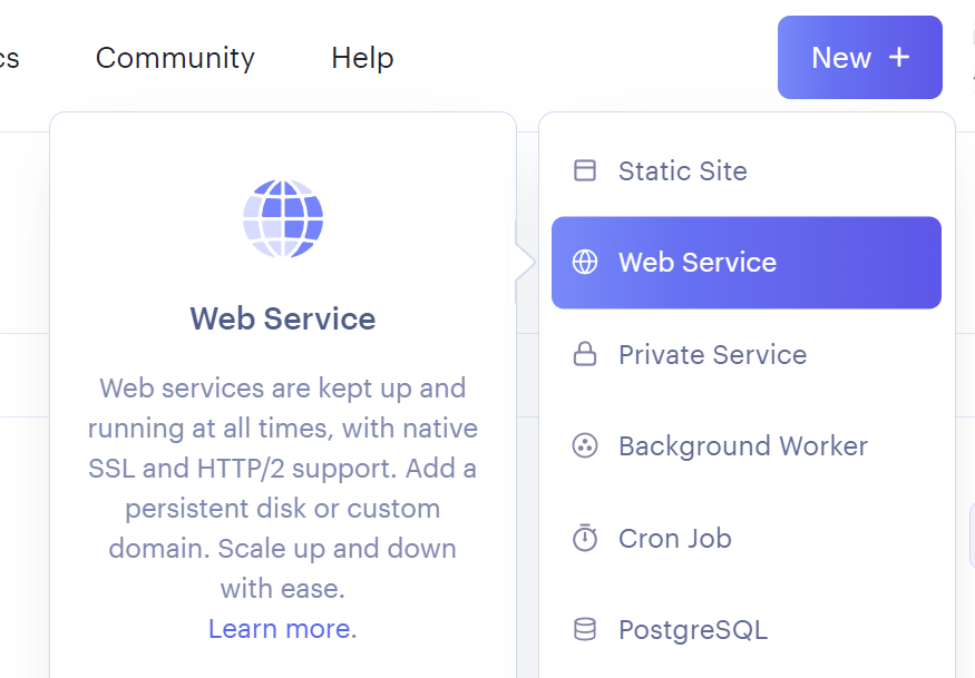登入後,點擊右上 New + 選擇 Web Service 來新增網路服務