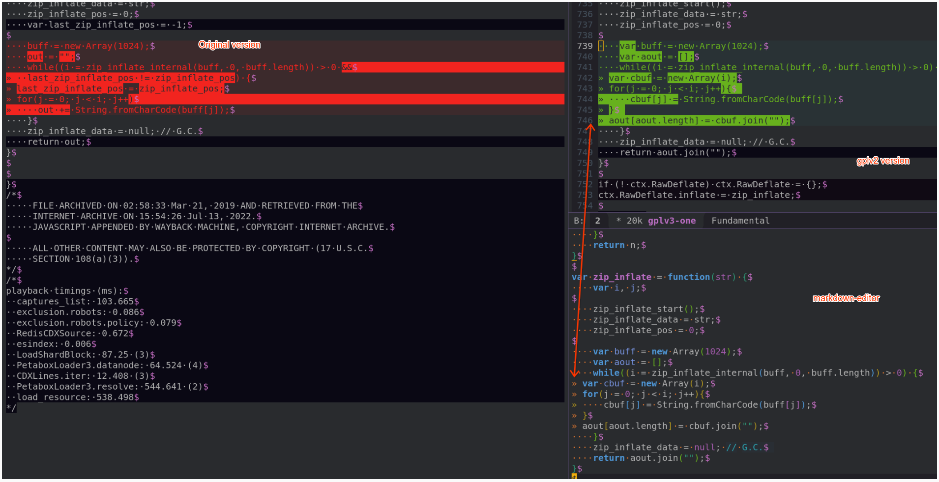 file currently mostly retains the copyright of the original author, Masanao Izumo, which originally put this library under the GPL. The copy of rawinflate.js in this repository is very similar to that file except it shares similarities with a gplv2 version of this file by dankogai. Putting this together we likely have some gplv2 license code being used in this project which has viral and potentially incompatible elements (learn more here).