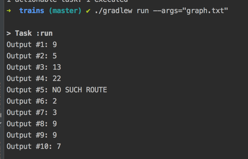 Output: For test input 1 through 5, if no such route exists, output 'NO SUCH ROUTE'. Otherwise, follow the route as given; do not make any extra stops! For example, the first problem means to start at city A, then travel directly to city B (a distance of 5), then directly to city C (a distance of 4).