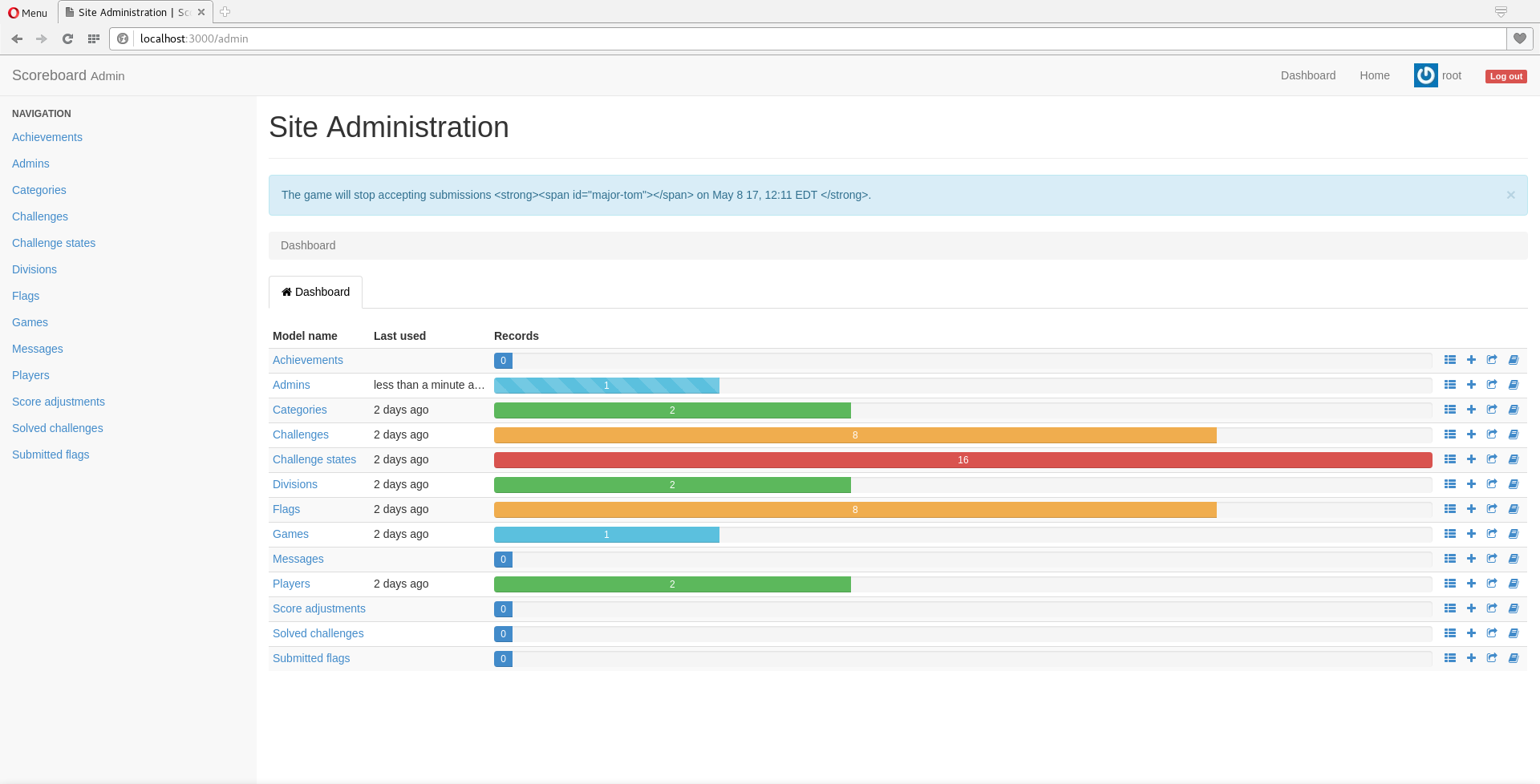On the [admin dashboard](http://localhost:3000/admin): There is a visual bug: `The game will stop accepting submissions <strong><span id="major-tom"></span> on May 8 17, 12:11 EDT </strong>.` Markups are escaped.