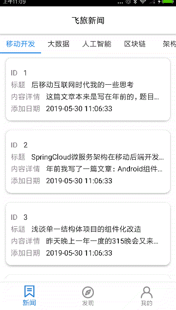 基本架构为组件化+MVP,数据由本地SQLLite数据库提供 以新闻资讯为功能,对app的界面进行了全新的改版,由新闻列表展示、新闻详情展示、新闻添加、新闻类型添加、删除这几个简单的功能组成,基本上覆盖了整个框架的所有核心的、常用的一些功能
