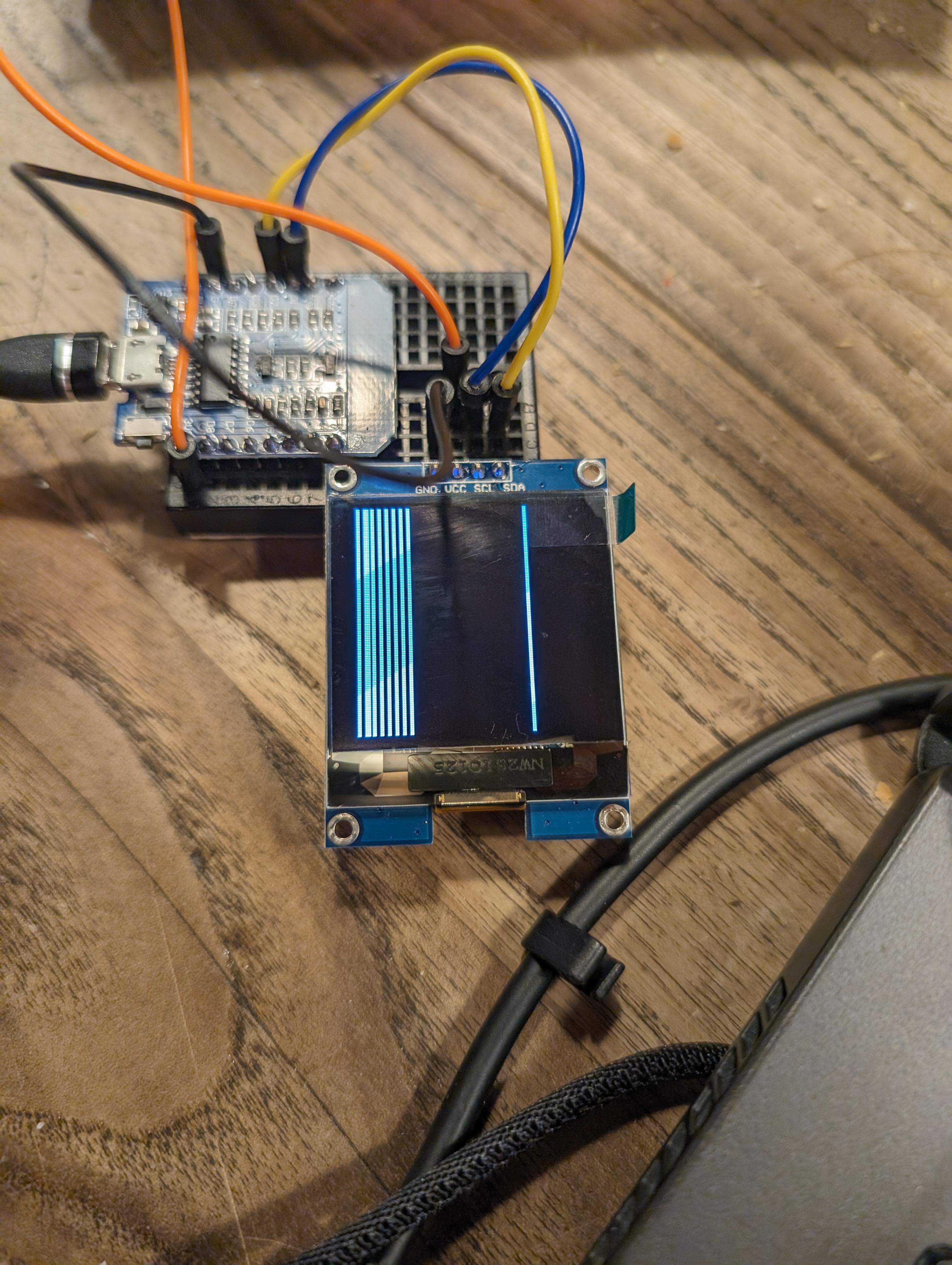 There doesn't seem to be a module for this specific screen model, and none of the ones I tried worked so I decided to try and modify the SSD1306 module. I've already looked at some Arduino/C libraries for the SSD1327 driver and had a peek at the datasheet but after some evenings experimenting I have to admit I'm quite stuck. When I flash the current code I have, I get a bunch of vertical lines for a few seconds, before the screen seemingly turns off.