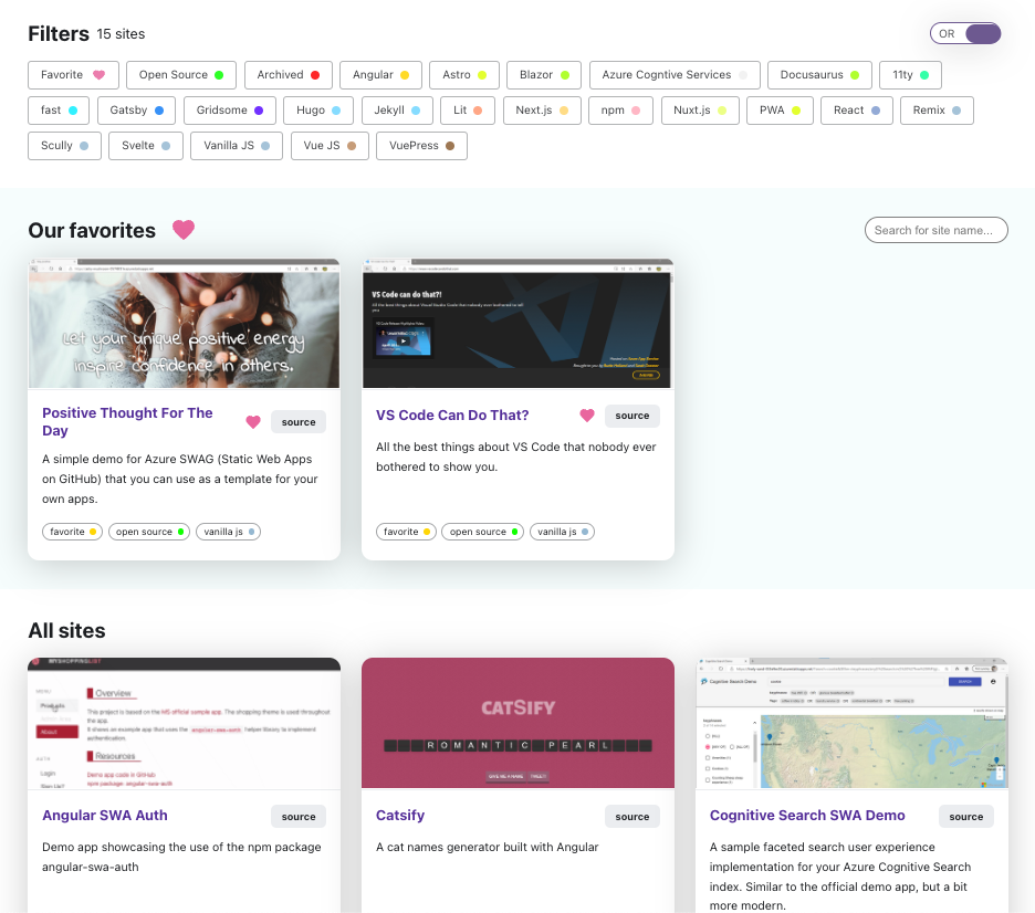 Welcome to the Azure Static Web Apps Gallery - a showcase of your projects - to inspire others and showcase your work!. Here's a sneak preview: