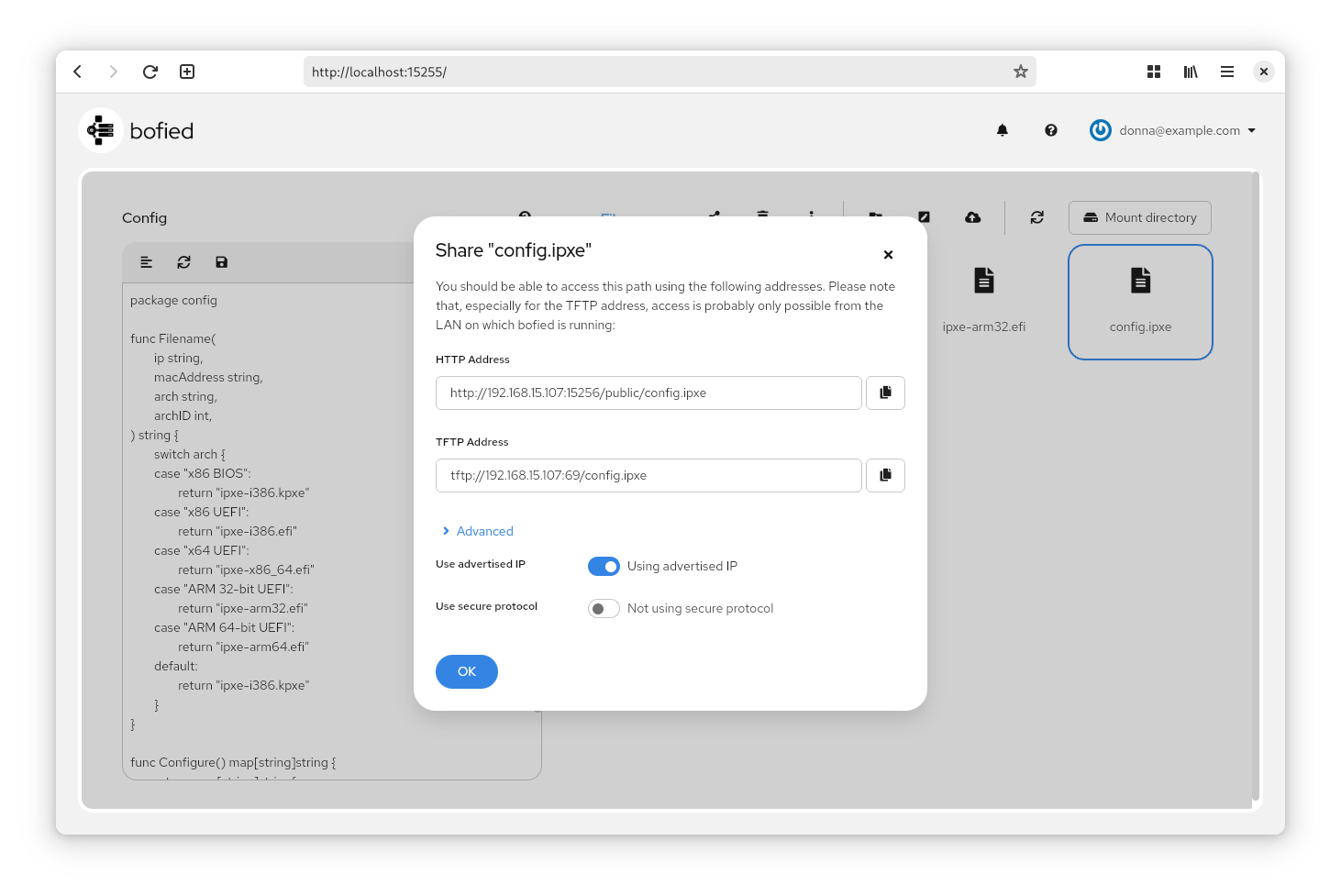 $ for port in 67/udp 4011/udp 69/udp 15256/tcp 15257/tcp; do sudo firewall-cmd --permanent --add-port=${port}; doneNow that the backend is running, head over to https://pojntfx.github.io/bofied/:
