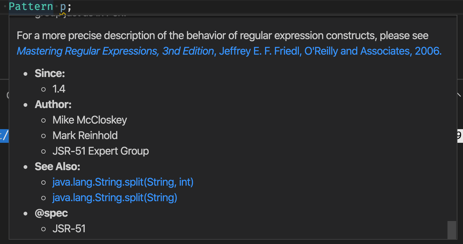 When hovering over "Pattern", jdt.ls returns a 122324-character hover, but the returned javadoc is truncated at 10000 characters by VS Code.