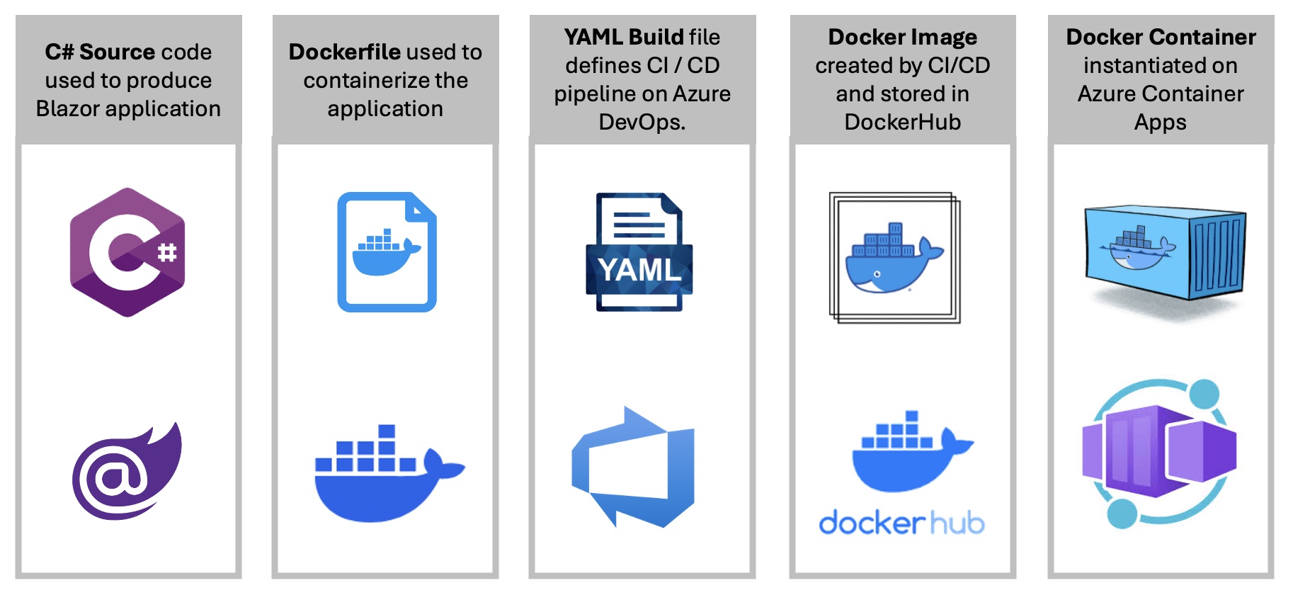The key focus of this project, beyond the standard MudBlazor application, is the dockerizing process and deployment of the dockerized application to Azure Container Apps using Azure DevOps. The figure below represents these critical steps, highlighting the artifacts in this project responsible for each of these key activities.
