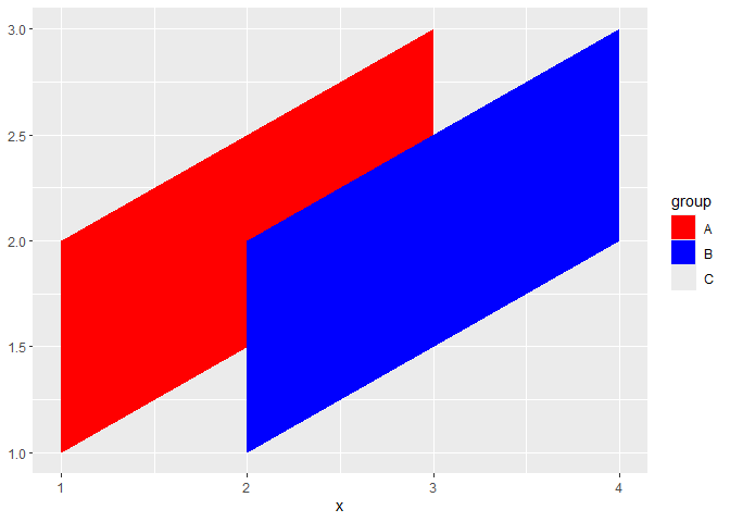 ggplot(data, aes(x = x, ymin = ymin, ymax = ymax, fill = group)) +