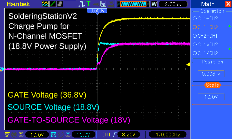 The microcontroller switches the heater on and off via the MOSFET. Since the temperature measurement must be done over the same line and against ground, the MOSFET has to be placed between the supply voltage and the heater (high-side switch). A P-Channel MOSFET is normally used for this configuration. However, N-Channel MOSFETs usually have a lower resistance (RDS (on)), in the case of the IRLR7843 only 3 milliohms. A low resistance means a higher efficiency and a lower heat development of the MOSFET. For an N-channel MOSFET to function as a high-side switch, an additional circuit is required to maintain a positive GATE-TO-SOURCE voltage after the MOSFET is switched on. This is done using a so-called charge pump consisting of a capacitor and a diode. The principle of operation is illustrated in the following graphic by Smallp Tsai: