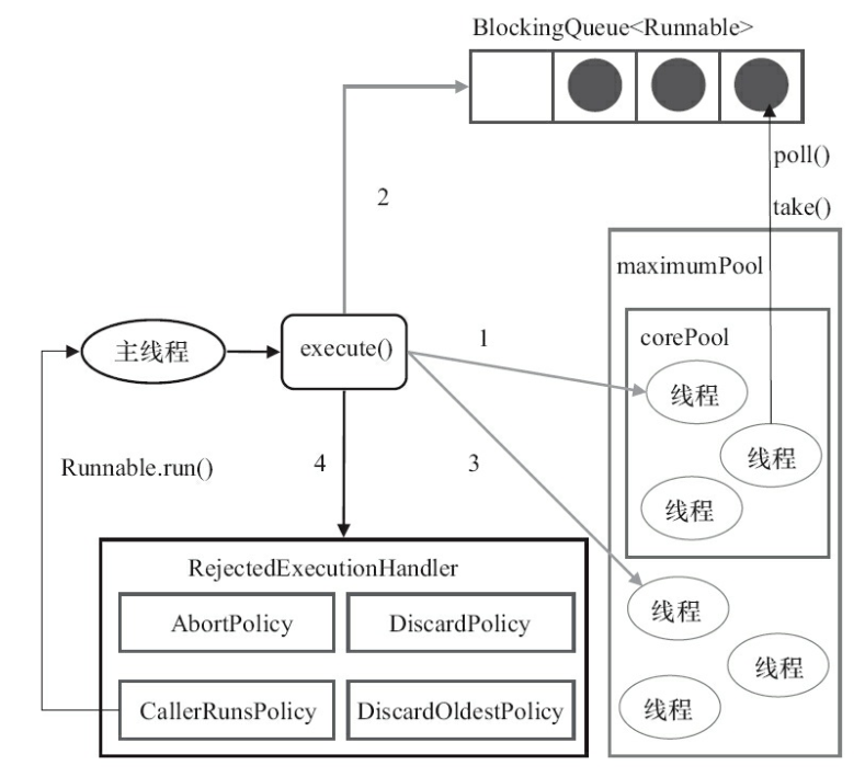 - CallerRunsPolicy:让调用execute()提交任务的线程执行任务。这种方式的弊端是该线程执行任务时,可能线程池中已经有很多任务已经执行完了,这就阻挡了后续任务的提交,降低了性能。